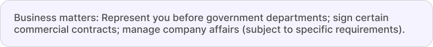 A General POA gives your chosen attorney broad authority to act on your behalf in personal, financial, business, and property matters within the UAE. It is ideal when you cannot be physically present to manage your affairs or need long‑term support you fully trust.